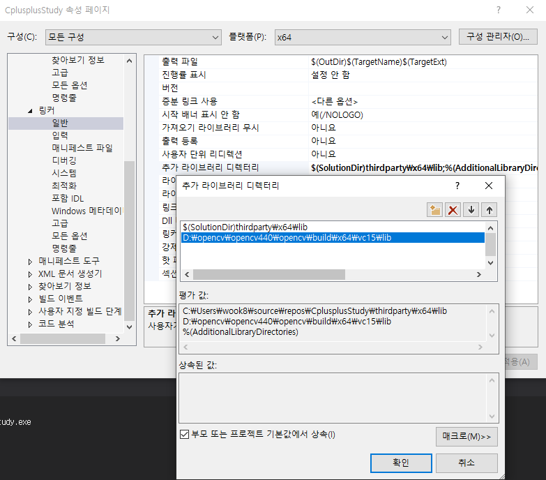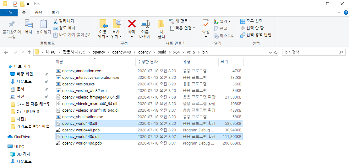 4번에 해당하는 경로에 가보시면 opencv_world440d.lib (디버그용), opencv_world440.lib (릴리즈용) 파일이 있는걸 확인하실 수 있습니다.
