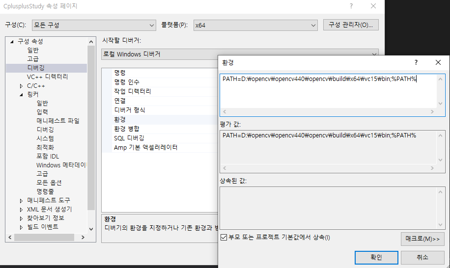 구성속성 -> 디버깅 -> 환경 -> dll파일이 있는 경로 추가
