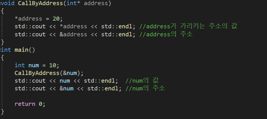 std::cout << *address << std::endl; //address가 가리키는 주소의 값