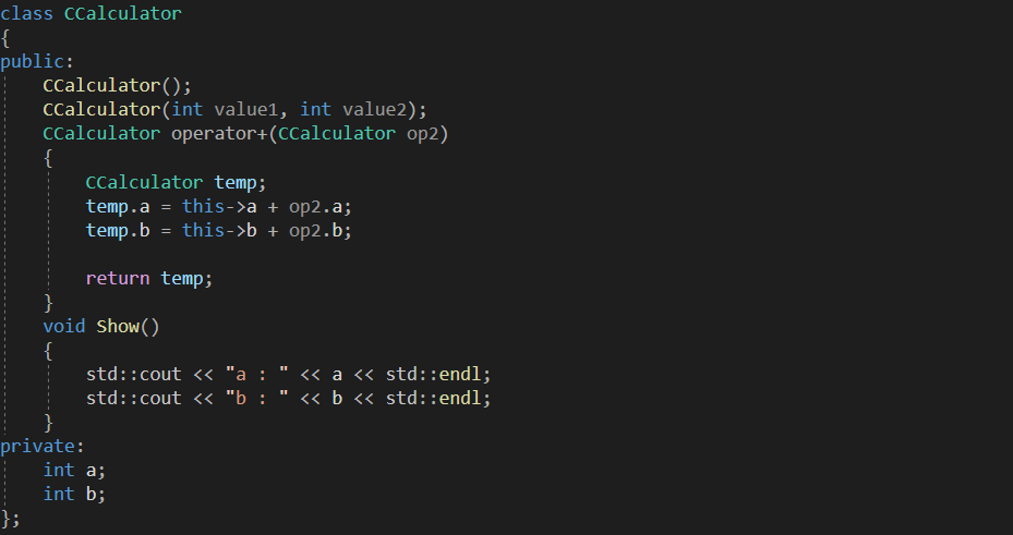#include <iostream> using namespace std; class CCalculator { public: CCalculator(); CCalculator(int value1, int value2); CCalculator operator+(CCalculator op2) { CCalculator temp; temp.a = this->a + op2.a; temp.b = this->b + op2.b; return temp; } void Show() { std::cout << "a : " << a << std::endl; std::cout << "b : " << b << std::endl; } private: int a; int b; }; CCalculator::CCalculator() : a(10), b(20) { } CCalculator::CCalculator(int value1, int value2) : a(value1), b(value2) { } int main(void) { CCalculator cal1; CCalculator cal2(40, 50); CCalculator result = cal1 + cal2; result.Show(); return 0; }