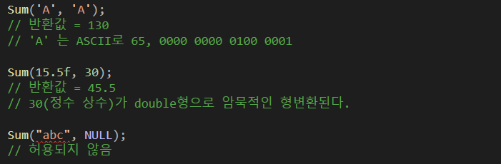 만약 함수호출시 다른 형태의 자료형이 인자로 전달된다면 어떻게 될까요? 작은 자료형은 큰 자료형으로 큰 자료형은 작은 자료형으로 암묵적인 형변환이 이뤄집니다.