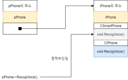 포인터 객체 pPhone은 CSmartPhone 타입인데 CIPhone타입객체 iPhone을 가리키고 있습니다. (상속 관계의 객체들은 서로를 가로지르는 타입 캐스팅이 가능합니다.) 당연히 pPhone의 타입이 CSmartPhone이기 때문에 정적바인딩이 일어나고, CSmartPhone에 정의된 RecogVoice()를 호출합니다.