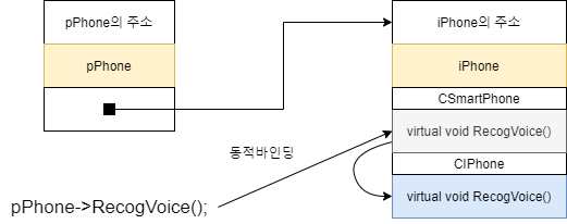 CSmartPhone 타입객체 pPhone이 CSmartPhon::RecogVoice()를 호출했지만(착각하시면 안되는게 기본클래스로 파생클래스를 가리키게 되면 기본클래스의 포인터객체는 기본클래스 내에 정의된 멤버만 호출할 수 있다는 점, 컴파일러는 업 캐스팅 사실을 아직 모릅니다 ㅎㅎ) virtual 키워드가 밀어내서 CIPhone 타입에 속한 CIPhone::RecogVoice() 가 호출되었습니다.